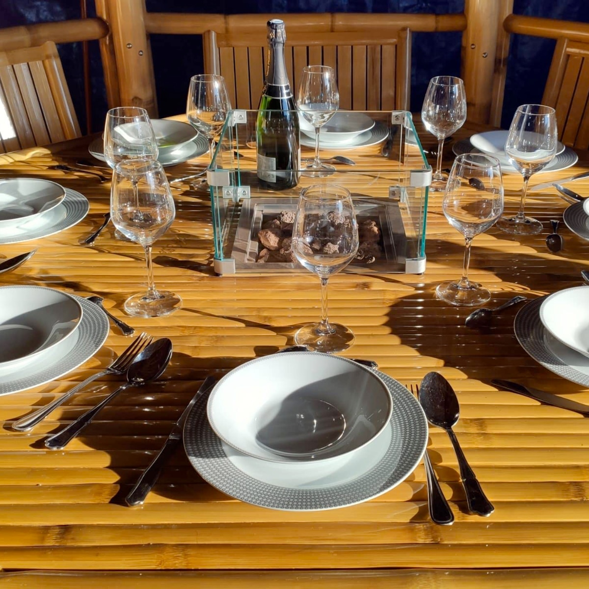 ALONA est livrée avec sa table repas 145 x 120 x 70 cm, 1 marchepied , ses coussins et ses toiles de protection fabriqués en France.