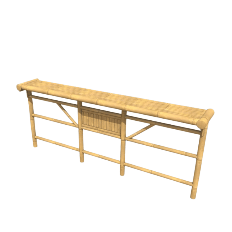Associé avec quelques tabourets de bar, le comptoir de 2,80 m environ présente un plateau en lamelles de bambou finement poncées pour recevoir couverts et verres de 42 cm.