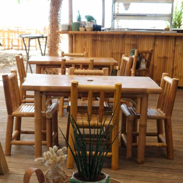 Table de repas 100% bambou naturel des Philippines traité sans pesticide, ni solvant. Plateau en lattes de bambou assemblé sur 2 traverses de pieds fixés par vis reliure à embout inox.