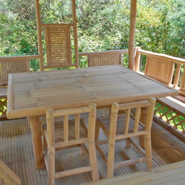 Table de repas 100% bambou naturel des Philippines traité sans pesticide, ni solvant. Plateau en lattes de bambou assemblé sur 2 traverses de pieds fixés par vis reliure inox.